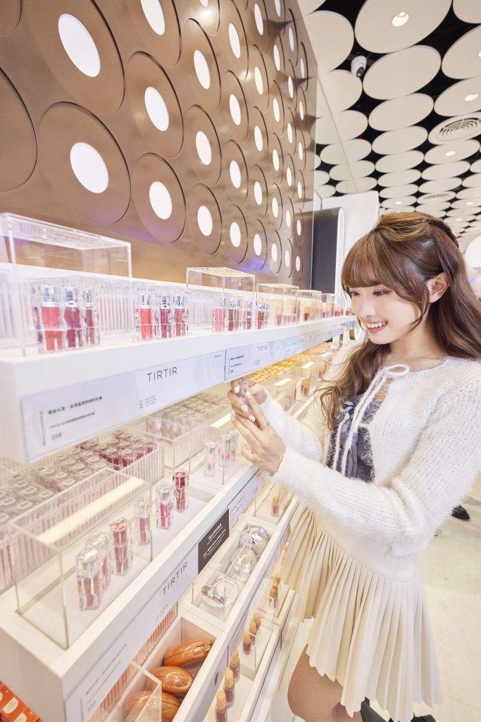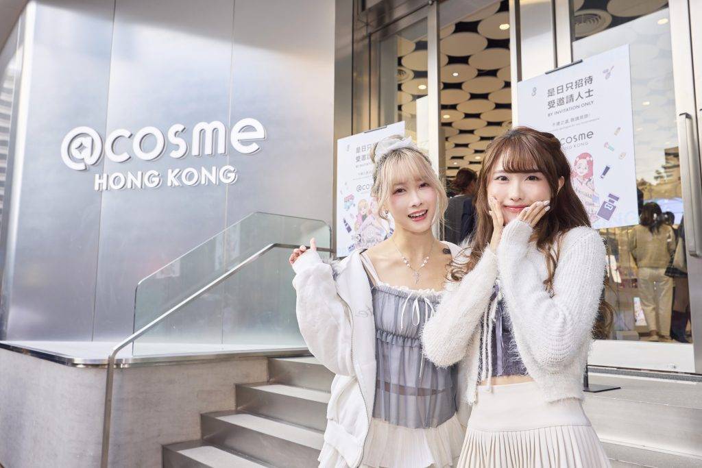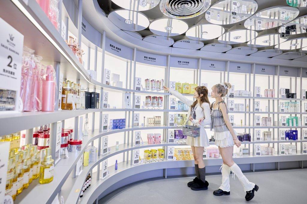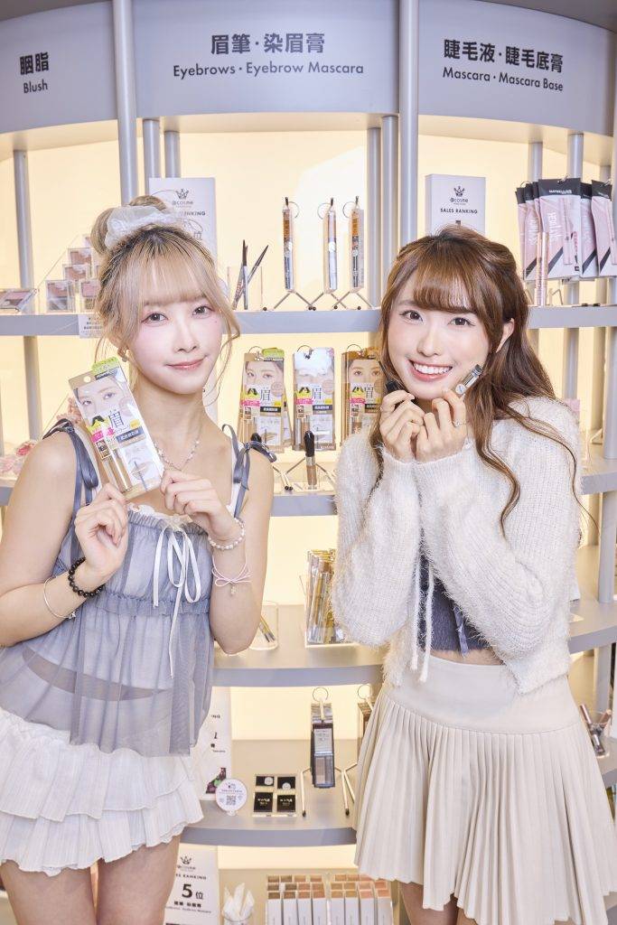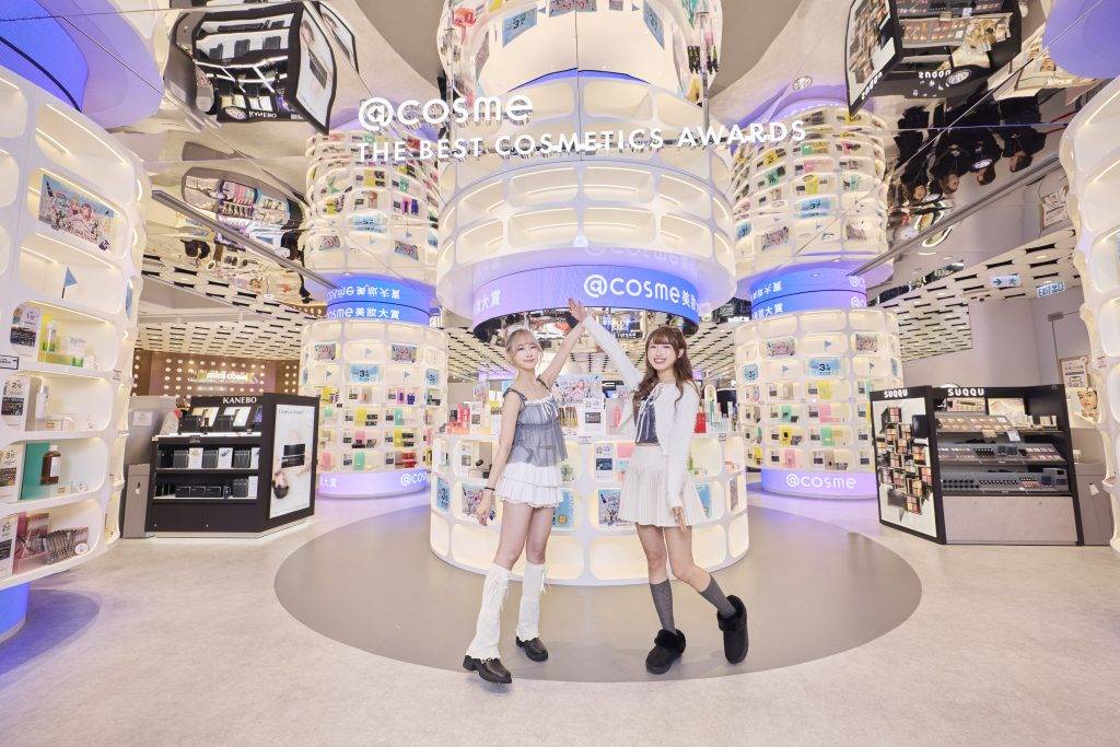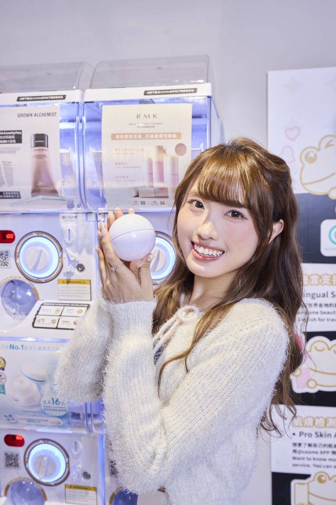 一入門口,Katie同MeMe已經被地下層幾支「港日大賞柱」震撼到。「嘩!呢支精華日本斷貨王嚟㗎!原來香港已經有得試!」Katie指住柱上的美妝產品,雙眼發光。幾支大賞柱放滿2025年最新日本同香港美妝大賞產品,擺到有如藝術裝置,兩個人立即舉機打卡,還拿起心水產品扮專業評測員,說要「頒個自己嘅大賞」。